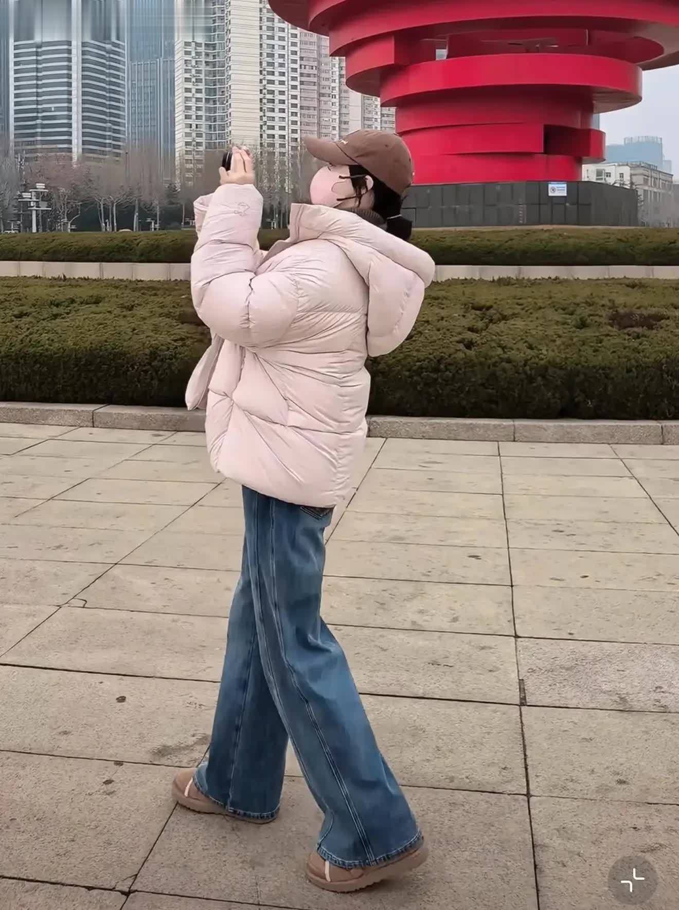米色短款羽绒服+橄榄绿高领衫!保暖又时尚!