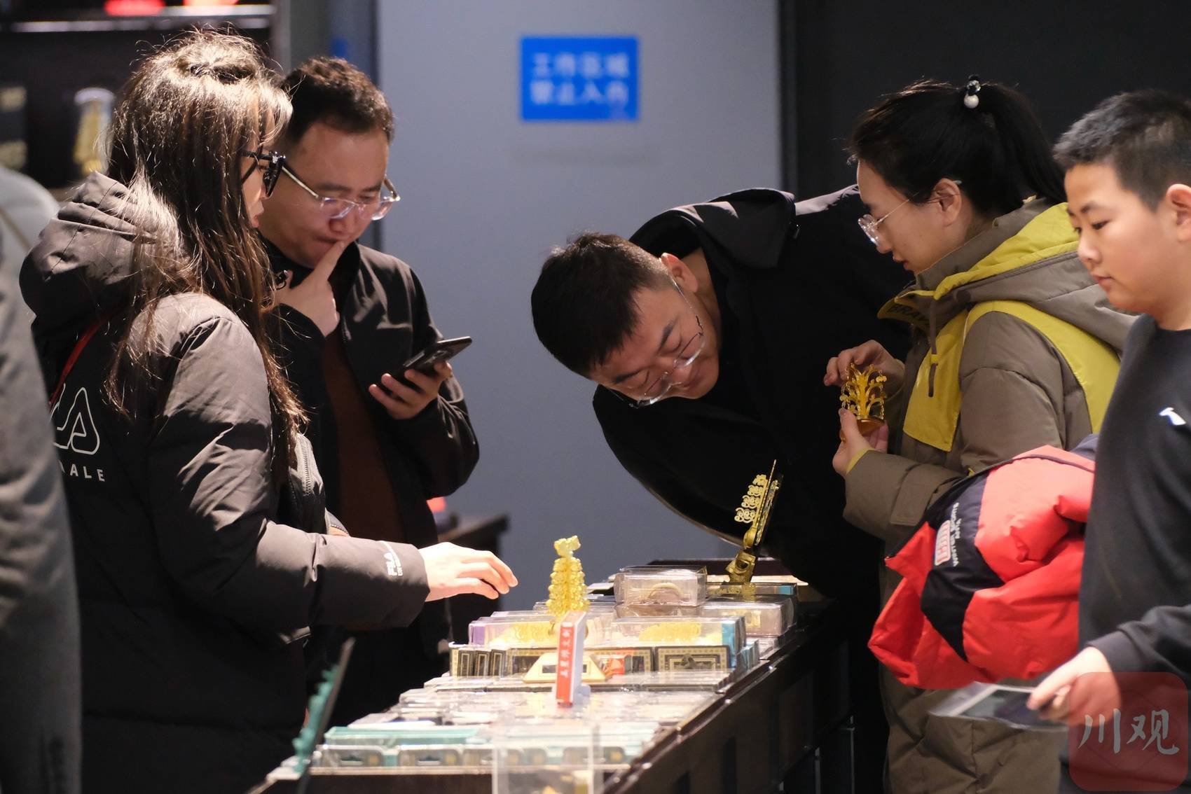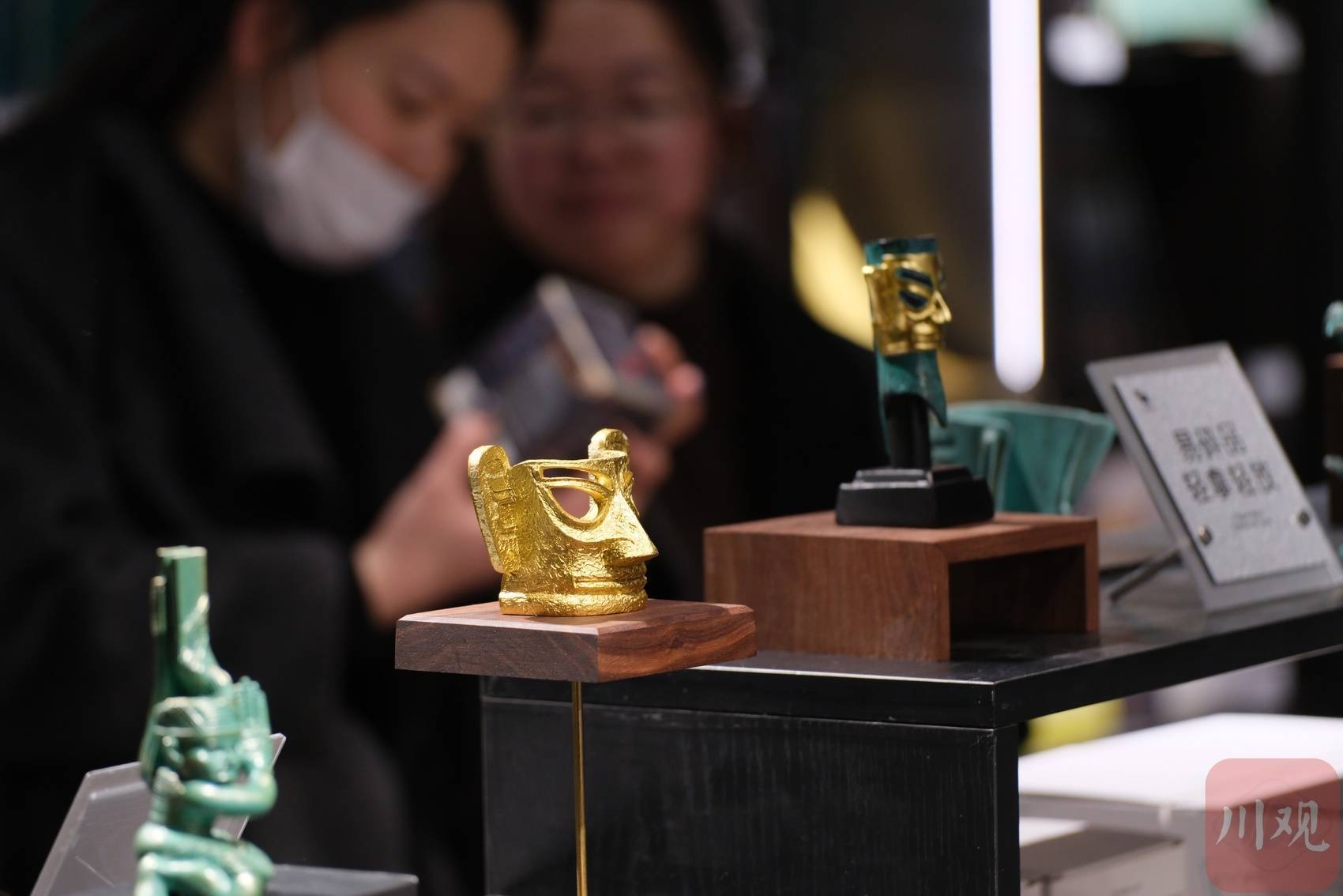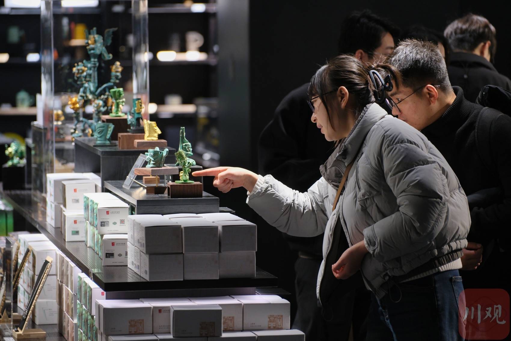 三星堆文创货架前,游客停下脚步,仔细挑选每一件盲盒和手办。