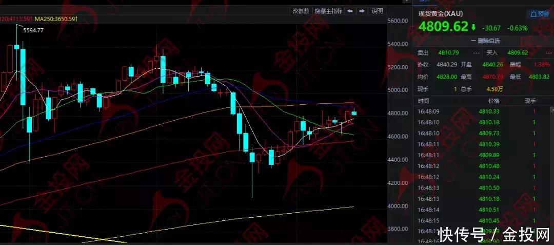 隔夜比较出名的配资平台,现货黄金收盘暴涨101.79美元,涨幅2.15%,报4841.63美元。今日欧市盘中,黄金小幅下跌,目前在4806美元附近徘徊。