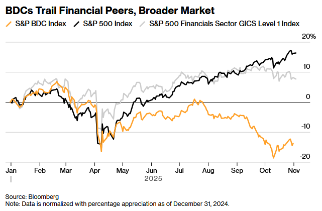 在汽车零部件供应商First Brands Group和次级汽车贷款机构Tricolor Holdings相继倒闭,以及两家银行因欺诈贷款遭受损失后,市场对信贷质量的担忧持续升温,并引发了美股在10月中旬的下跌。CEF Advisors总裁John Cole Scott表示:“BDC的最新财报实质上是对私募信贷的实时压力测试。相比银行,BDC的财报能提供更及时的信贷数据——包括贷款逾期情况、公允价值计量、发起方行为以及杠杆成本。”