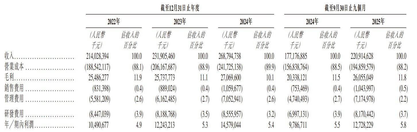 于2023年、2024年及2025年截至9月30日止九个月,该公司毛利率分别为11.1%、10.1%、11.8%。