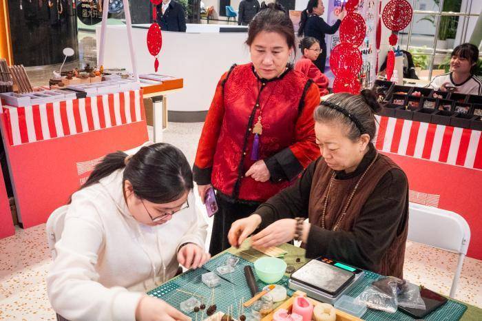 作为沉浸式体验延伸,60余家非遗品牌齐聚,带来绒花、柴烧、古法制香等项目。