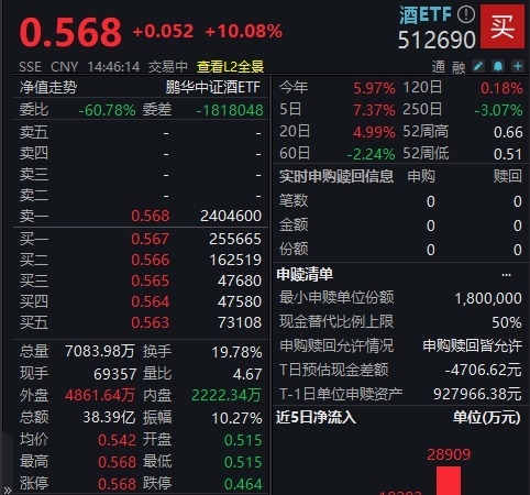 酒ETF(512690)盘中触及涨停。金种子酒、皇台酒业、水井坊、金徽酒、泸州老窖、古井贡酒、舍得酒业、酒鬼酒、五粮液、老白干酒、山西汾酒等批量涨停,白酒板块内其他个股均涨超8%。