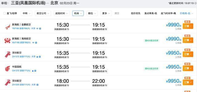 三亚到北京机票价格