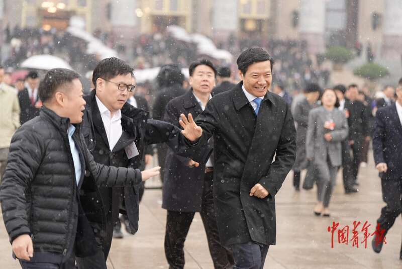 3月4日,北京,人民大会堂外,十四届全国人大四次会议预备会议后,全国人大代表,小米集团创始人、董事长兼首席执行官雷军(右一)走出会场。中青报·中青网记者 李隽辉/摄