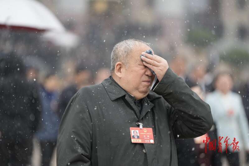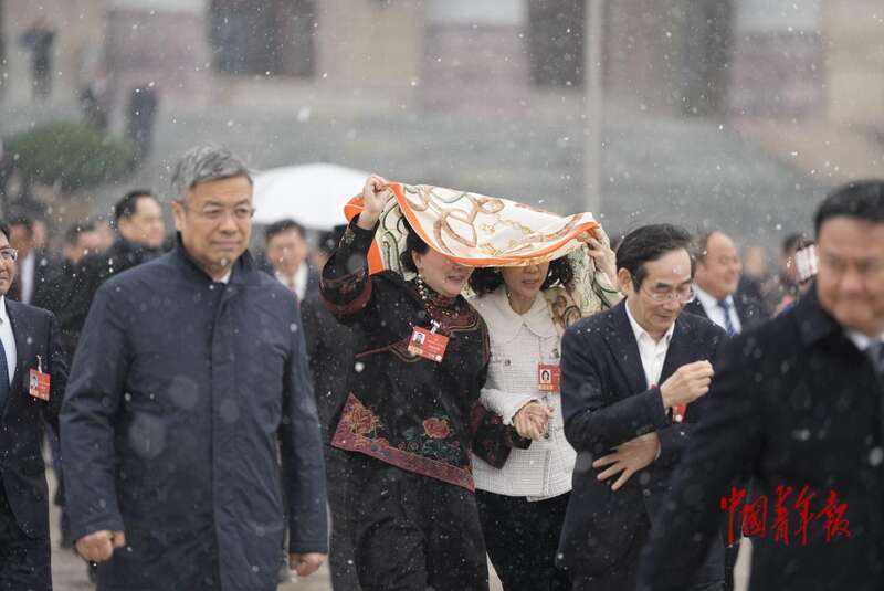 3月4日,北京,人民大会堂外,十四届全国人大四次会议预备会议后,走出会场的代表们相互致意。4日上午,十四届全国人大四次会议举行预备会议,选举大会主席团和秘书长,表决大会议程草案。当天北京下起了小雪,代表们在春雪中开启今年的全国两会之旅。中青报·中青网记者 李隽辉/摄