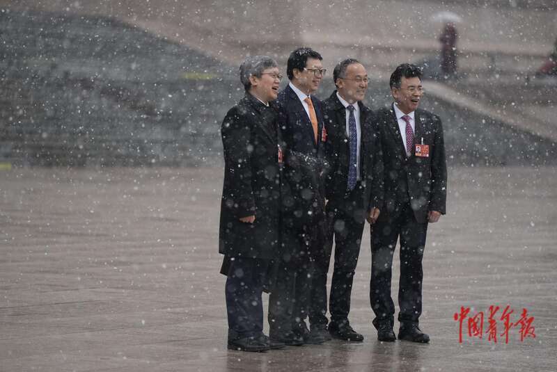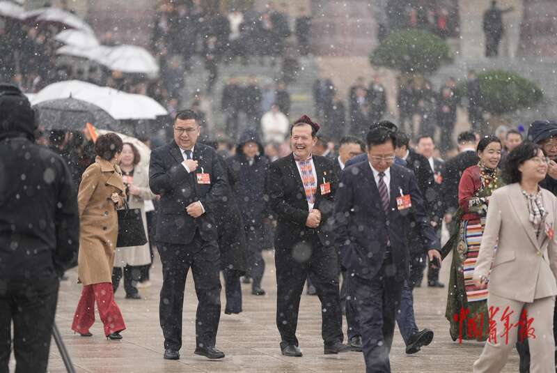 3月4日,北京,人民大会堂外,十四届全国人大四次会议预备会议后,代表们在会场外合影。中青报·中青网记者 李隽辉/摄